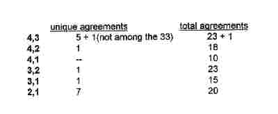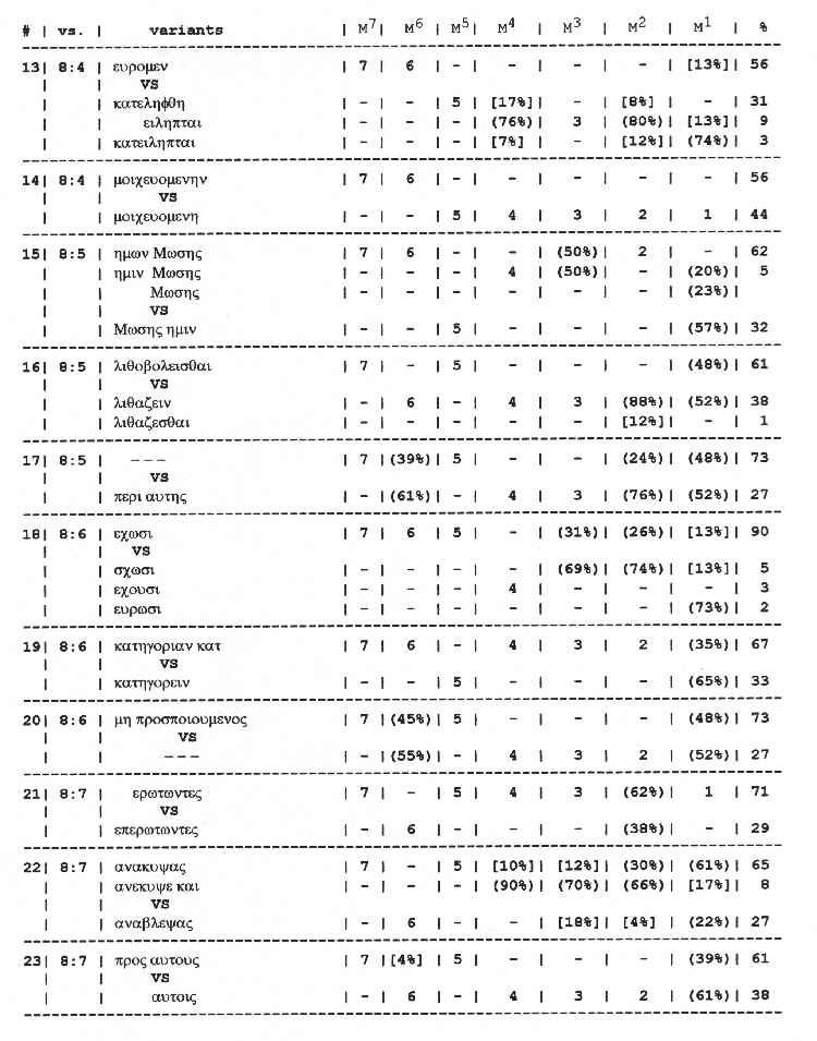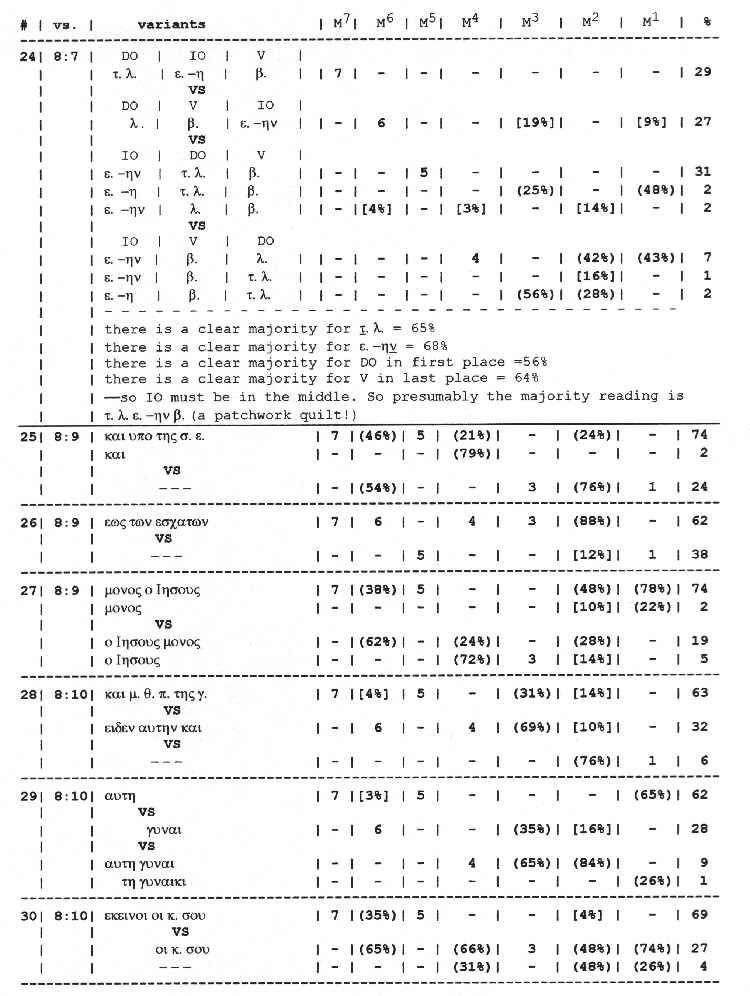 With this background I now present the 33 variant sets upon which this study is based. The total is sometimes 99% or 101% because I used whole numbers. Groups M4,3,2,1 are frequently internally divided, and their constituent MSS often go astray with a variety of added variants which are not recorded on the following chart, which is why the groups do not always add up to 100%. I use [ ] for 1-20%, ( ) for 21-95% and the whole # for 95+%.
