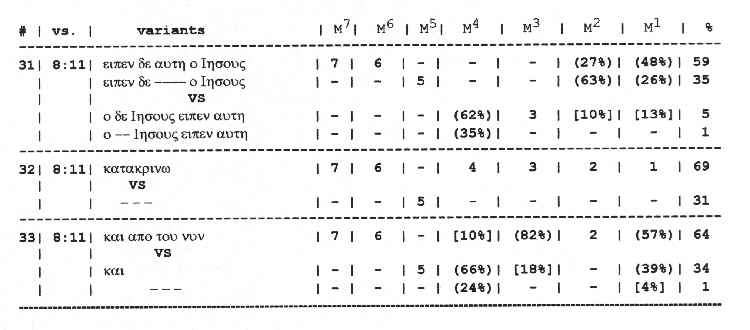 So, what have we learned with reference to our larger concerns? To my mind, rather than constituting an embarrassment John 7:53-8:11 confirms the validity and workability of Majority Text Theory. The transmission was "normal" in the main. In a normal transmission the copyists of a given generation would almost never commit the same error independently, and seldom would more than one introduce an error at any given point—thus the true reading should have majority attestation at all levels. In spite of a rather high incidence of variation (considering that "Alexandrian" and "Western" witnesses were excluded to begin with—thereby avoiding most of the results of the "abnormal" transmission) the pericope vindicates our expectation. Even though it evidently passed through more turbulence than any other passage in John's Gospel, still the original text is attested by a clear majority of the MSS.