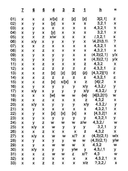 The following chart makes it easier to see the pattern. The reading of 7 is always "x"; if 6 differs it is always "y"; if 5 differs it is always "z". "w" is used for any variant distinct from the first three. Brackets are used when a variant is clearly derived from another. Braces are used for a second derived variant. Parentheses are used to indicate separate groupings. Backward slant lines are used when a grouping is anomalous. A question mark means that I don't know what is going on. The "=" column gives the reading followed by h, and demonstrates that h had a mixed text.