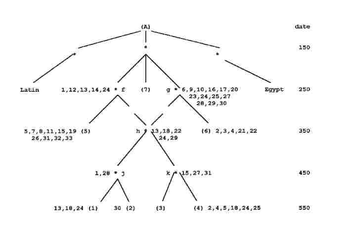 I now offer a stemma that I believe matches and accounts for the statistical evidence just described. The Autograph is represented by "A". The letters f,g,h,j,k designate reconstructed archetypes. The numbers within nodes are those of Soden's MS groups. The numbers beside the nodes refer to the variant sets in which the node introduces an error (such errors vindicate the positing of a node, especially the reconstructed ones): thus f introduces five errors, 7 introduces none, g introduces thirteen, etc. The solid lines indicate linear descent; the broken lines indicate occasional influence (smaller dashes = lesser influence). The symmetry is arbitrary, as is the chronology. I am not concerned to defend the chronology, but I do happen to think that it is "in the ballpark"—a possible, even reasonable, approximation.