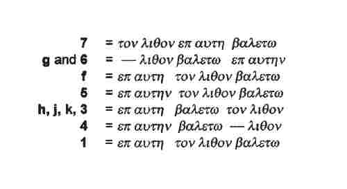 Assuming that 7 is right all the other times, it has far and away the best "credibility quotient". If we start with 7, 6 would be a stylistic "improvement", dropping the article and placing the indirect object last (perhaps he took "first" to be modifying "stone", as a number of prominent English versions have done). Why f would put the indirect object first is not clear, unless it be for emphasis. h devised a new constituent order, which was retained by all its descendants, except for (1) which was influenced by 5. Considering the fluctuating alignments throughout the variant sets it would appear that copyists frequently had access to more than one exemplar and were not above picking and choosing—it seems reasonable to suppose that they would be most willing to do so when confronted with confusion in the tradition.
