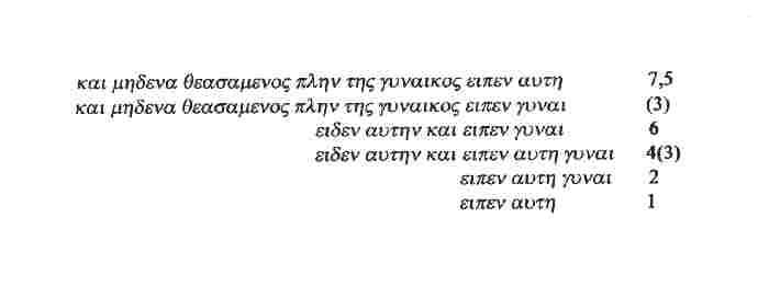 28) 7 and f preserve the original. g creates a variant, followed by 6 and h; j omits. The solution here involves the following set as well. Faced with a lacuna before eipen gunai, if someone felt the need to create a gloss like the longer reading would he also change "woman" to "to her"? It is much more likely that he would supply something like the shorter variant and leave "woman" intact. But on the face of it the longer reading is not the sort that a copyist would concoct out of nowhere. If we start with the longer reading it is easy to see where someone could be troubled by the seeming contradiction—it says that Jesus "saw nobody" except the woman when in fact there was a crowd taking in the proceedings. So he "solves" the problem by replacing it with the innocuous shorter reading; but now he has two pronouns too close together, so he changes the second one to "woman". It may be instructive to combine sets 28) and 29):